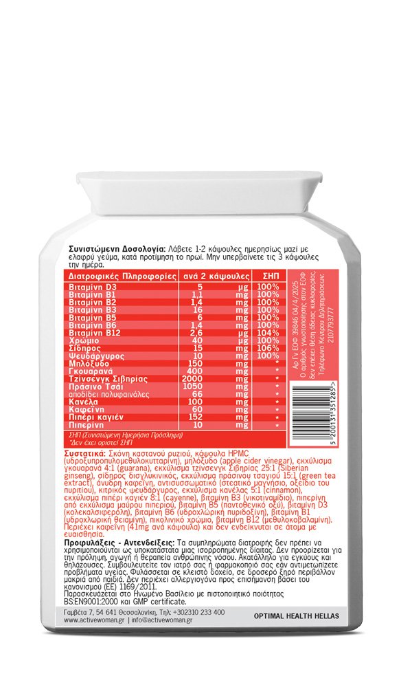 The formula includes plant extracts such as guarana, Siberian ginseng, apple cider vinegar, green tea, cinnamon, capsaicin, and caffeine, which contribute to body stimulation and energy support.